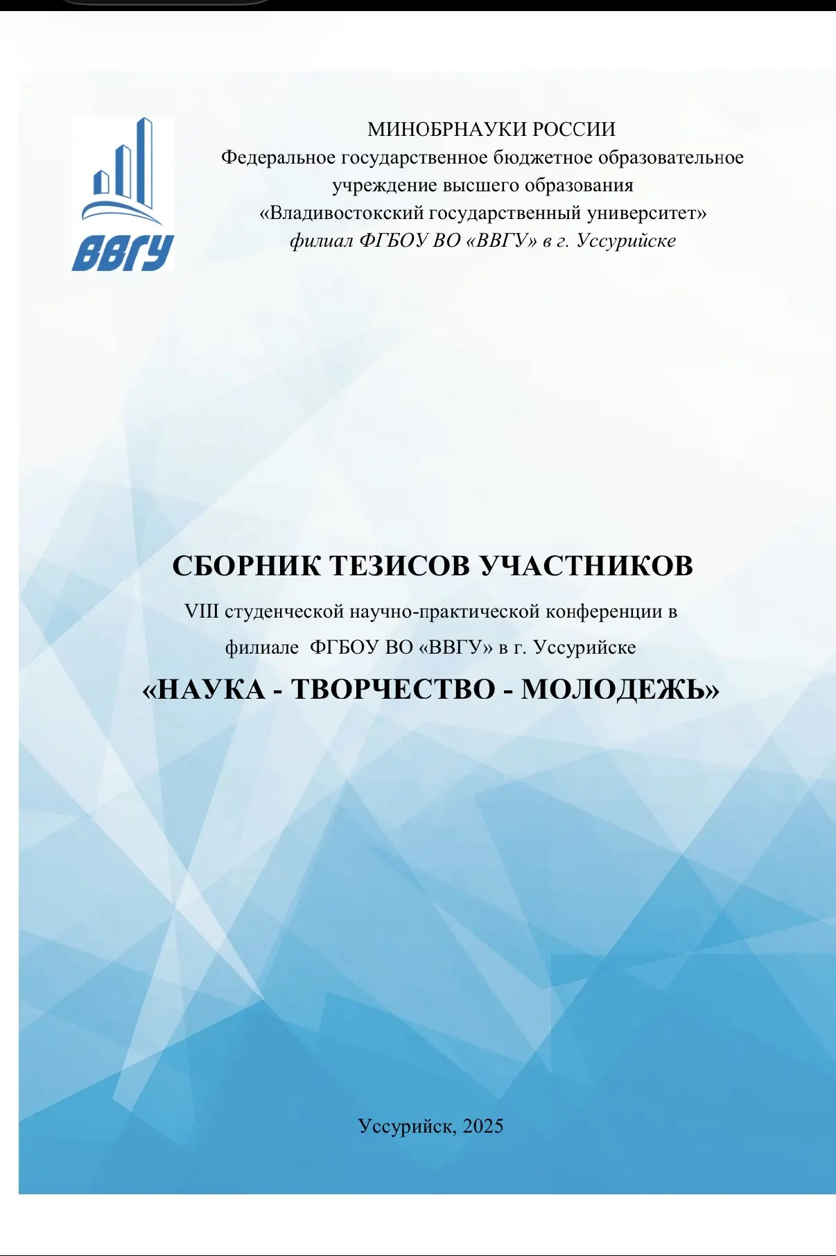 Выпущен сборник тезисов участников VIII студенческой научно-практической конференции в филиале ФГБОУ ВО «ВВГУ» в г. Уссурийске «Наука - Творчество -Молодежь»